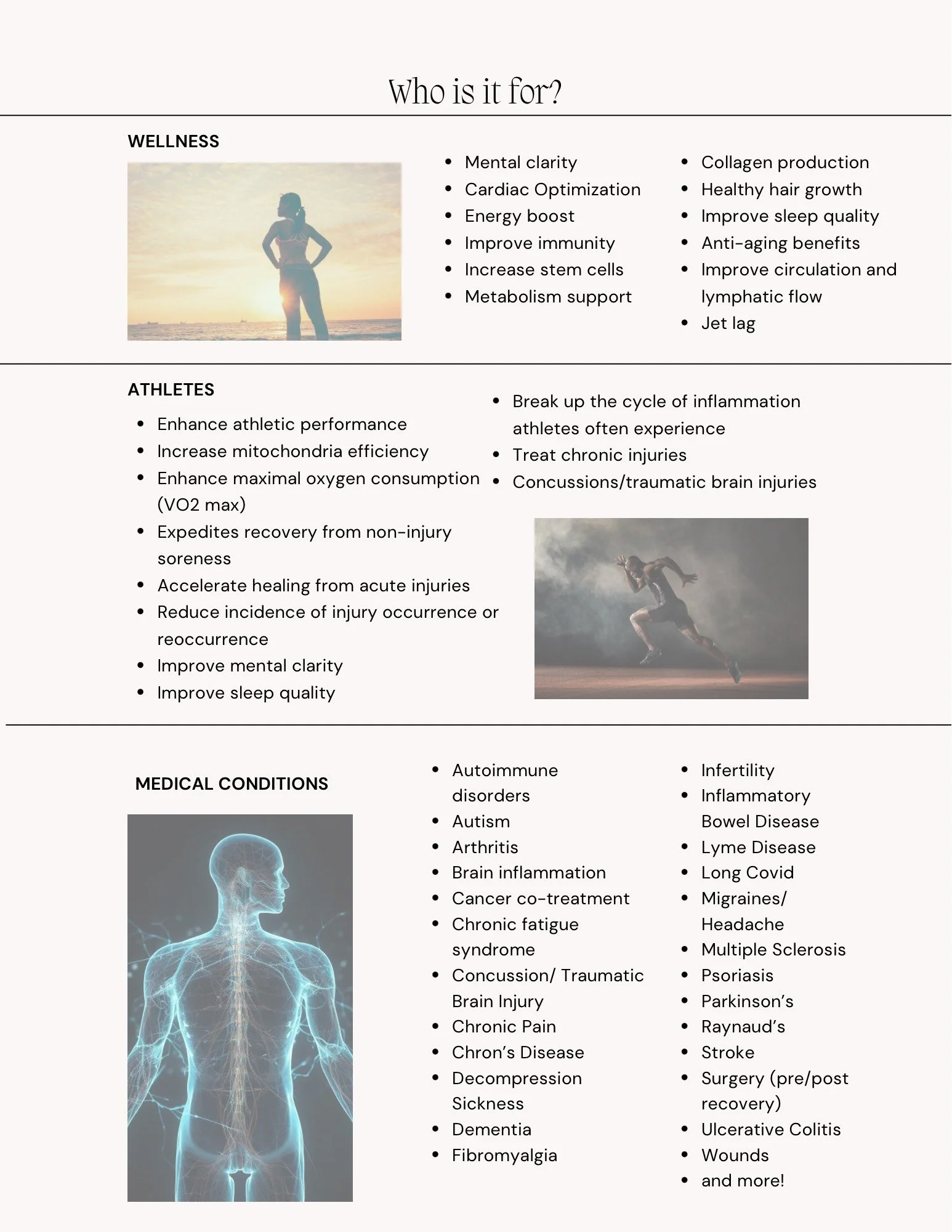 This stimulates the body to self heal, increases stem cells, creates new blood vessels, increases energy production, and decreases inflammation, pain, and swelling. HBOT also enhances the immune system and has epigenetic effects on DNA/gene expression.